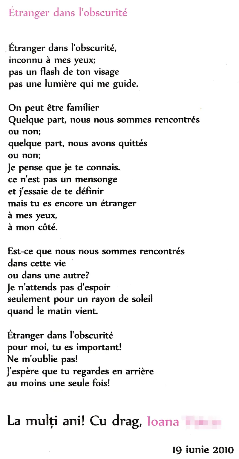 Asta a fost făcută în seara în care am făcut și eu 18 ani, în timp ce dansam cu o minunăție de fată cu care tot flirtam de ceva timp și n-am reușit decât să-i fur un sărut în seara aia. Avea iubit, măcar nu m-a plesnit. Mi-a scris o poezie în franceză de ziua mea și o am și acum prin cutia mea cu lumini și întunericuri.